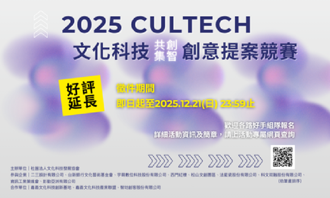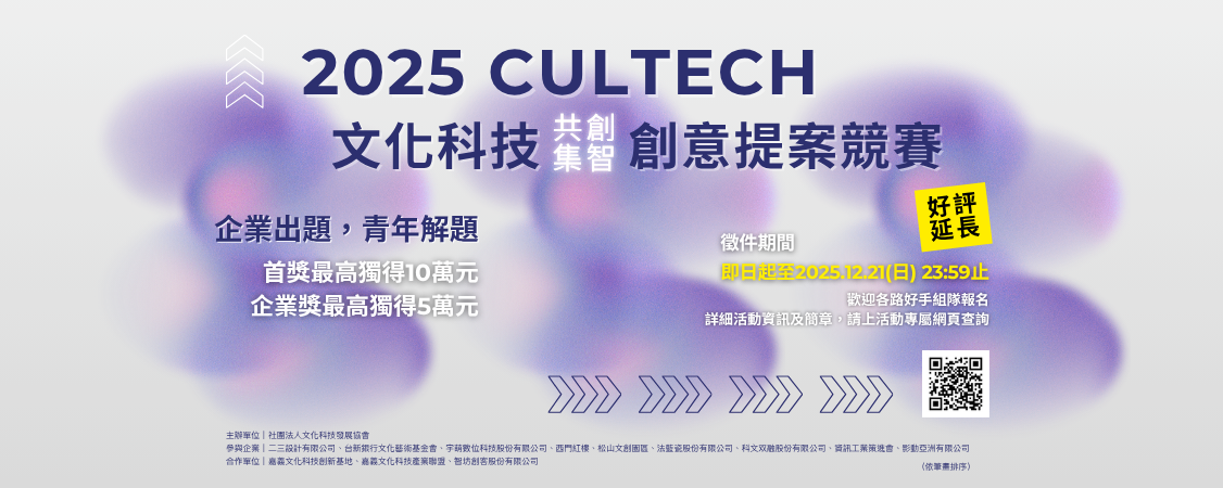多元跨域企業集結,徵求文化科技新創意,歡迎各界團隊大展身手 最受矚目的文化科技提案競賽熱烈徵件中!由文化科技發展協會主辦的「2025 CULTECH文化科技共創集智創意提案競賽」即日起至11月3日止接受報名徵件。今年賽事持續以「企業出題,青年解題」為核心,廣邀全台新業界人才、新創團隊及學生提出創新提案,透過文化與科技的融合,回應企業需求並探索更多跨域合作的可能。