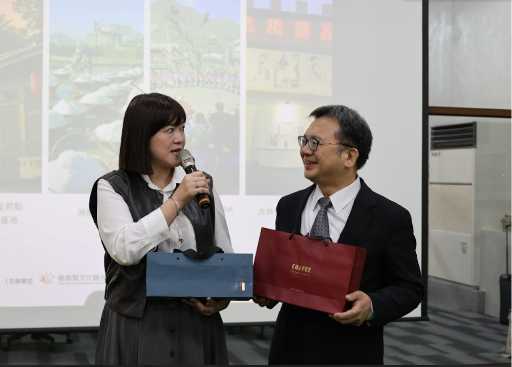嘉義縣文化觀光局長徐佩鈴(左)特別致贈嘉義咖啡及茶給國發會副主委詹方冠。嘉義文化科技創新基地/提供