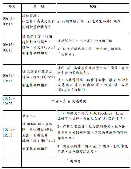 (Tony Yang)AI科技應用與品牌行銷領域擁有超過 30 年經驗的專家。具備跨國品牌行銷與科技整合的實戰經驗。專精於 AI 影音動畫製作、AI 圖文應用及自媒體實作,協助企業與個人利用生成式 AI 提升數位行銷效率 此課程將以品牌行銷策略為核心,結合由TONY 老師獨家設計,以 Google Gemini 為底層模型的「品牌行銷AI 工具」,在 4 小時內,掌握運用 AI 高效產出高品質文本、圖像、音樂及影音的實戰能力,將嘉義的在地文化與您的品牌特色深度結合,引爆社群聲量,提升顧客訂房率與品牌忠誠度。